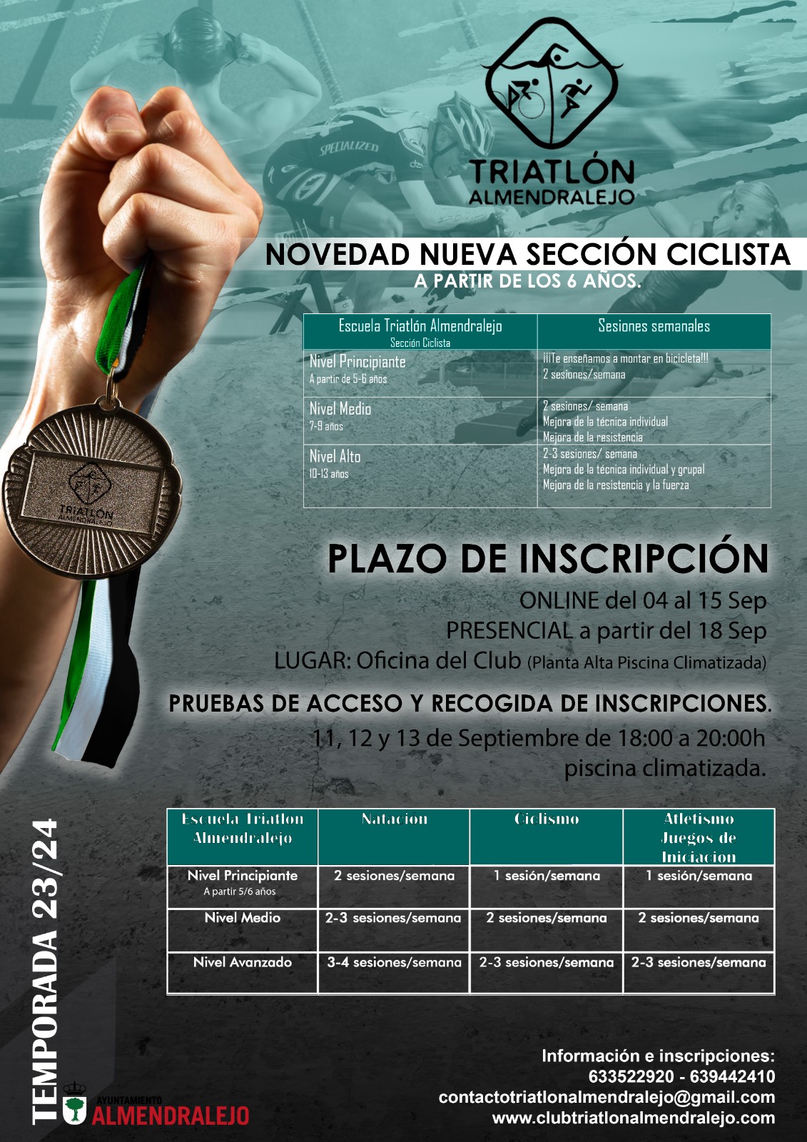 También podrá inscribirse para reservar su plaza a partir del 4 de Septiembre por correo electrónico: contactotriatlonalmendralejo@gmail.com o por teléfono llamando o dejando mensaje de WhatsApp en los números 633522920/639442410