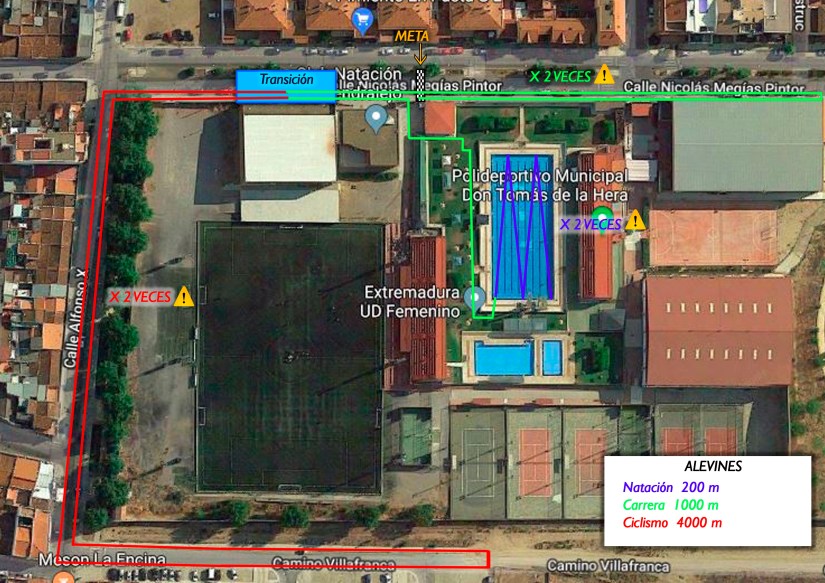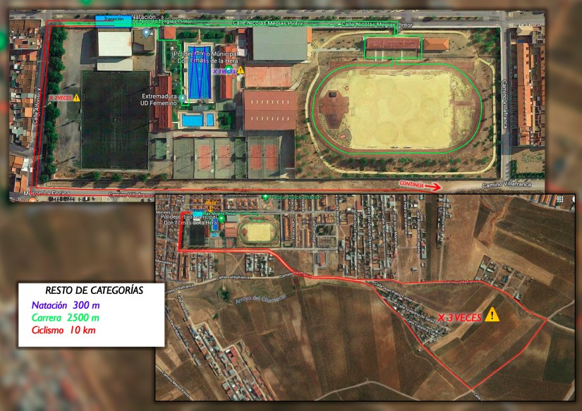 El Domingo 9 de Junio tendrá lugar una nueva edición del Triatlón Cros Ciudad de Almendralejo. Mantenemos el formato habitual teniendo que completar 300 metros en piscina, seguidos por 10 kilómetros de MTB sobre un circuito de de 5 kilómetros al que habrá que darle dos vueltas y terminar con 2,5 kilómetros de carrera a pie sobre asfalto.